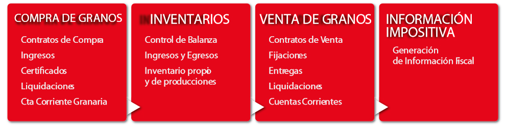 Es la solución integral para empresas acopiadoras de granos y cereales que permite administrar sus circuitos de información en tiempo real. Prevé la certificación y liquidación de operaciones, los procesos de compra, inventarios, venta y fondos integrándolos a la contabilidad e impuestos y conectividad total con los aplicativos ONCCA. Ofrece la trazabilidad completa del grano acopiado. Se complementa con la compra/venta de insumos y semillas a productores y la comercialización por corredor, exportador.